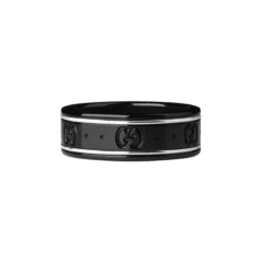 El emblemático patrón GG está grabado en un anillo de corindo sintético negro, enriquecido con detalles de oro blanco de 18 quilates para un contraste sutil.