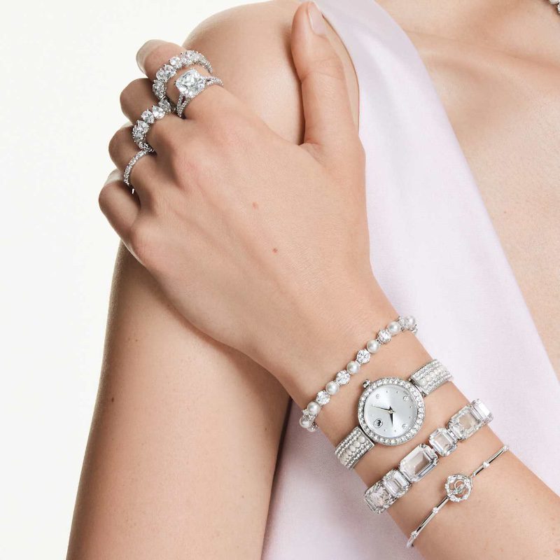 Este anillo de Swarovski muestra la brillante belleza de las resplandecientes piedras facetadas. Los elementos blancos en forma de gota, distribuidos en una única fila, reflejan y refractan bellamente la luz. Las formas puristas y elegantes de este anillo lo hacen perfecto para combinar con otros accesorios y con looks apilados de tendencia con anillos a juego. Es una elección excelente para realzar un atuendo para ocasiones especiales, y una muy buena idea de regalo.
