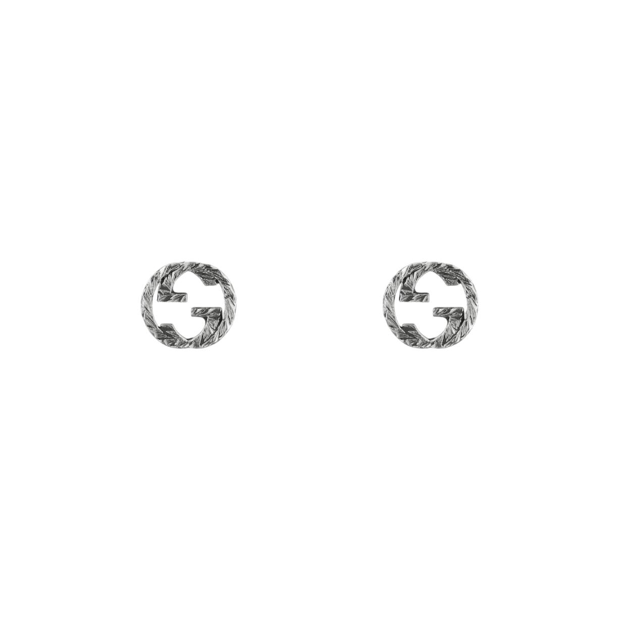 Pendientes de botón G entrelazados en plata de ley 925 con patrón grabado.