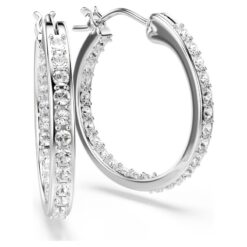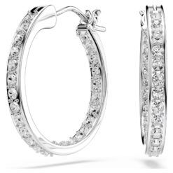 Este clásico par de pendientes es fácil de usar en cualquier ocasión. El borde exterior de cada aro chapado en rodio viene delicadamente adornado con pavé de cristal transparente, lo que le aporta un brillo suave a este diseño atemporal.