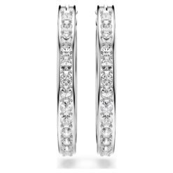 Este clásico par de pendientes es fácil de usar en cualquier ocasión. El borde exterior de cada aro chapado en rodio viene delicadamente adornado con pavé de cristal transparente, lo que le aporta un brillo suave a este diseño atemporal.