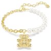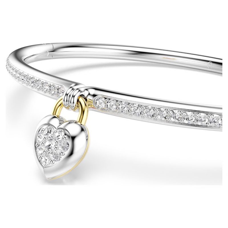 Este esbelto brazalete, que es una lujosa declaración de romanticismo, está adornado con cristales transparentes y presenta un corazón inspirado en un medallón en el centro. El motivo romántico luce una Swarovski Zirconia rosa y baño en tono oro en un lado, y pavé de cristales transparentes con baño de rodio en el otro. Llévalo con el anillo a juego para maximizar el look del amor.