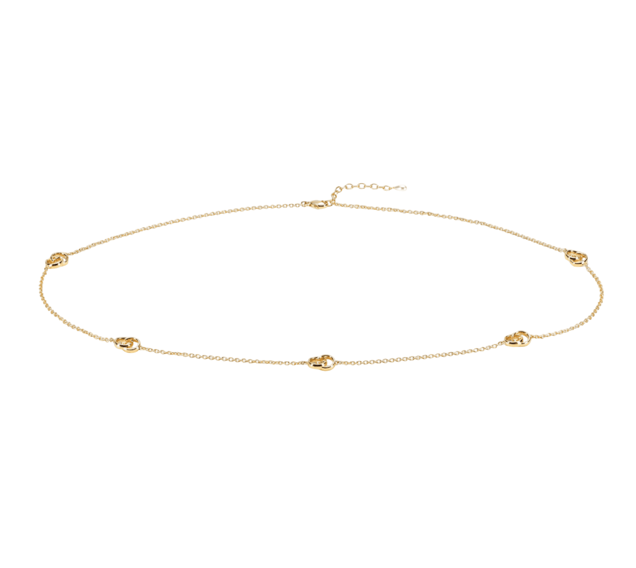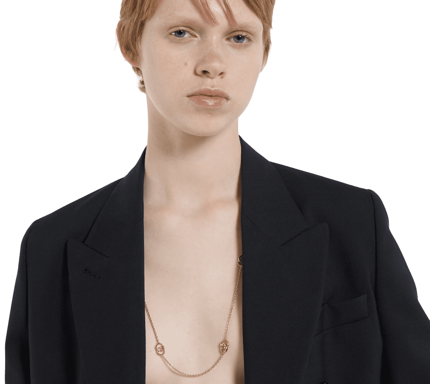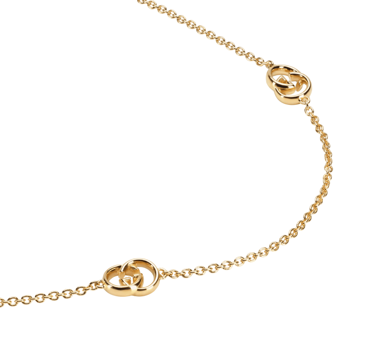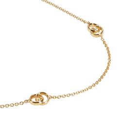 En una variante a modo de delicados adornos, el motivo de GG engalana un collar de cadena de oro amarillo. El mítico logotipo tan célebre en los años 60 es representativo de las iniciales del fundador Guccio Gucci, y desde entonces se ha reintroducido en formas e interpretaciones muy diversas.
