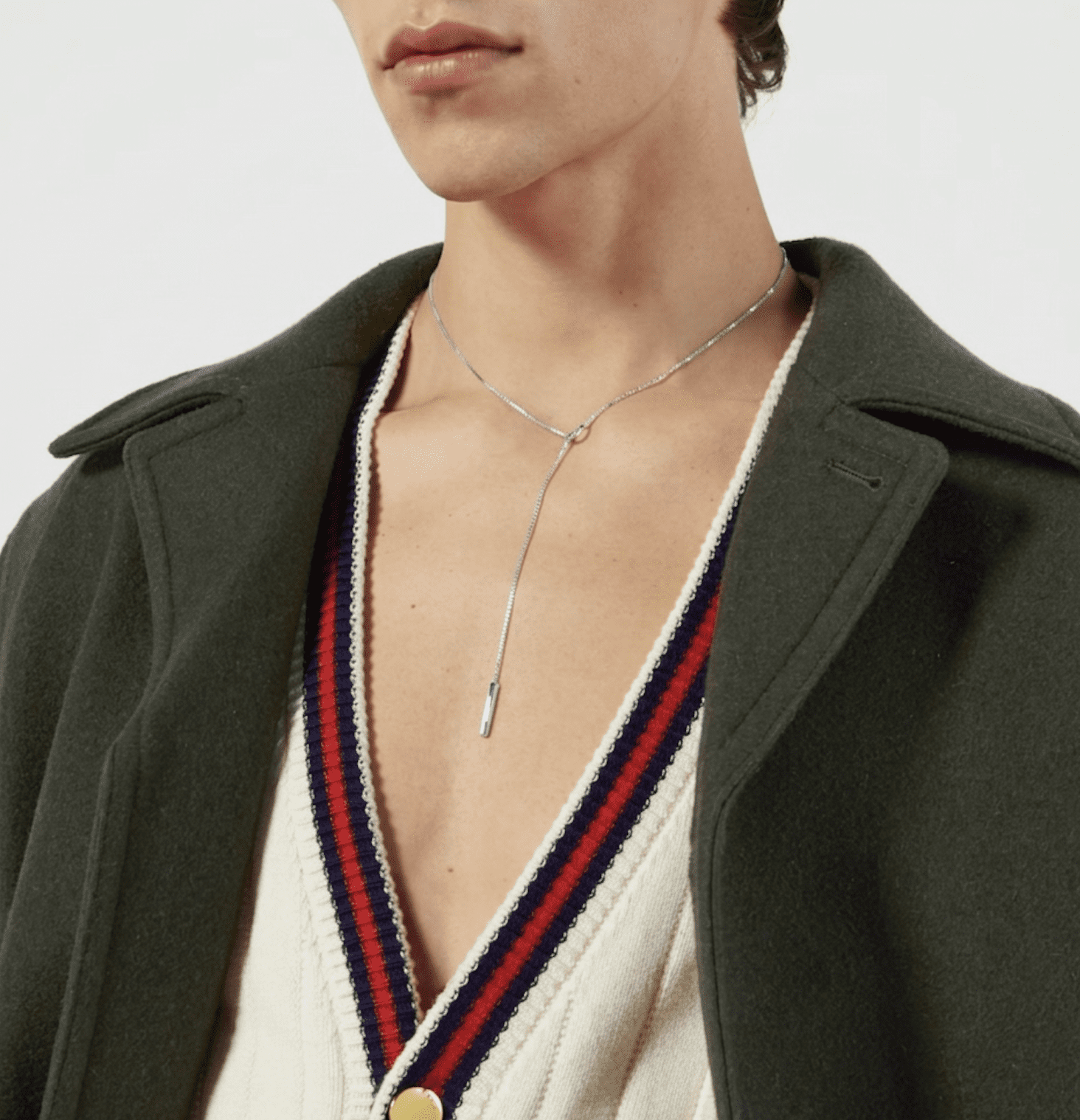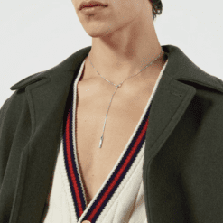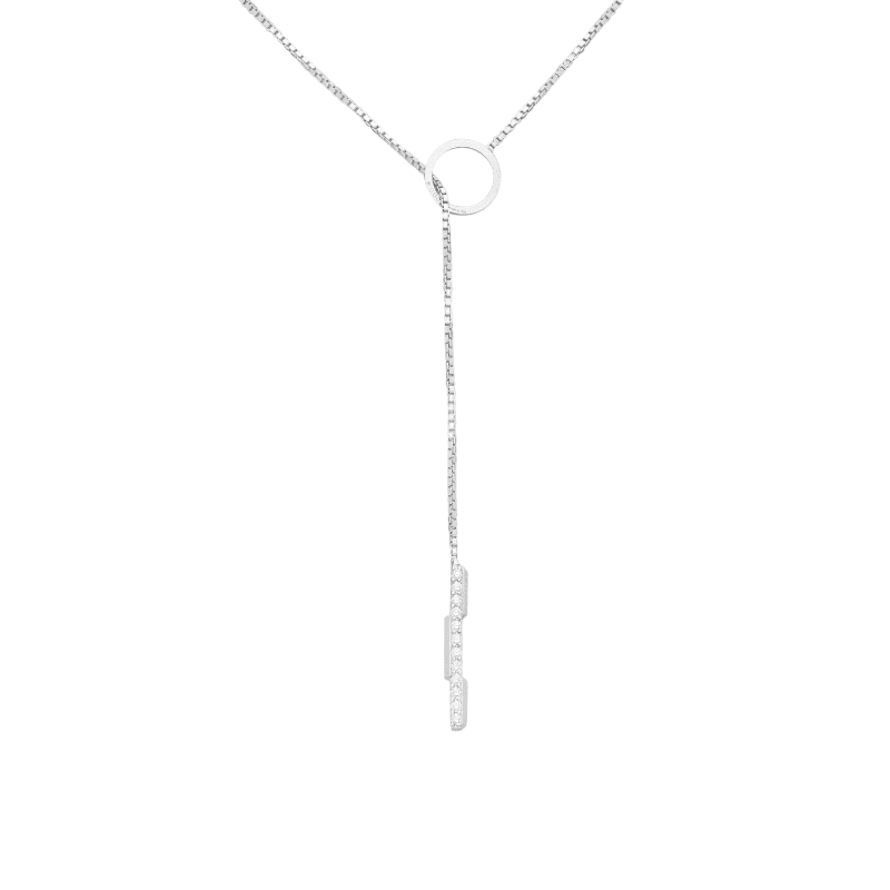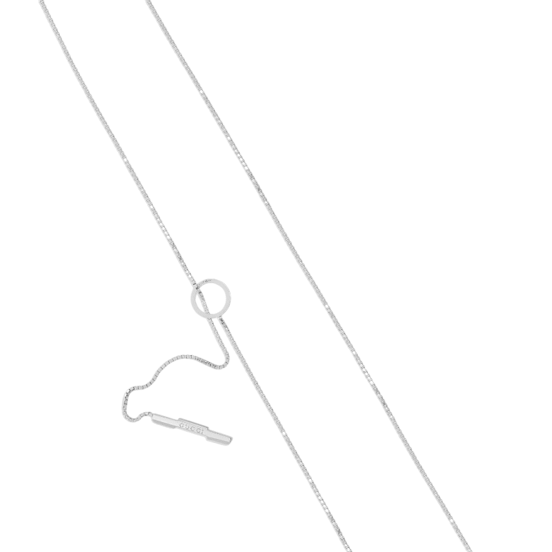 La colección Gucci Link to Love explora el romanticismo contemporáneo y cuenta con nuevos símbolos del amor. La colección combina distintos tonos dorados y una mezcla de acabados para desdibujar las líneas entre la masculinidad y la feminidad. Todas las piezas de la colección inspiran formas personales de llevarlas gracias a la posibilidad de crear conjuntos en combinación con otras. Este collar lazo de oro blanco de 18 quilates se realza con el grabado «Gucci» en la barra colgante.