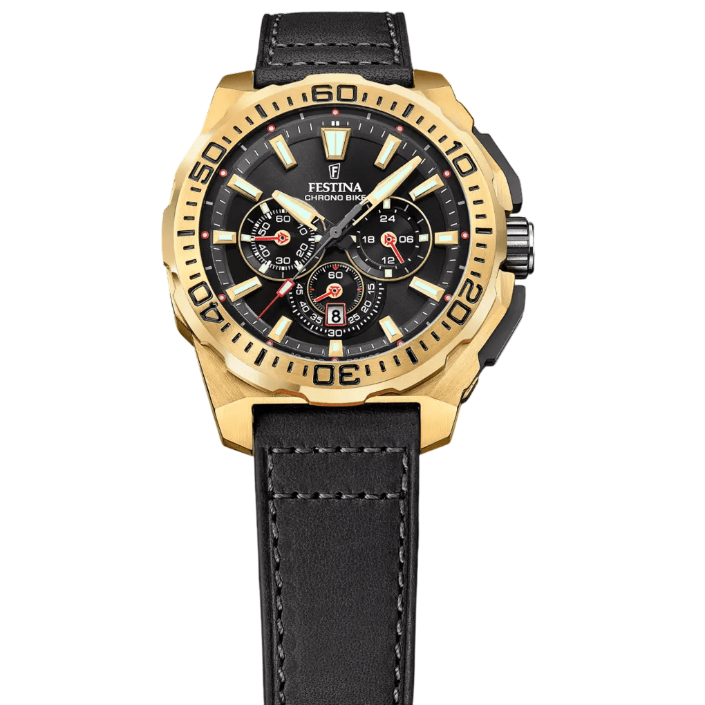 El Festina Chrono Bike 2025 es la combinación perfecta de deportividad y elegancia, diseñado para quienes buscan precisión y estilo en una sola pieza. Su caja de acero inoxidable de 45,5 mm garantiza resistencia y durabilidad, mientras que su correa de cuero aporta un toque sofisticado y un ajuste cómodo en la muñeca. Equipado con un movimiento de cuarzo MOS20, este cronógrafo ofrece una medición del tiempo precisa e incorpora una ventana de fecha a las 6 en punto para mayor funcionalidad. Su esfera, con detalles en colores vibrantes, índices aplicados y agujas luminiscentes, asegura una excelente legibilidad en cualquier condición de luz.