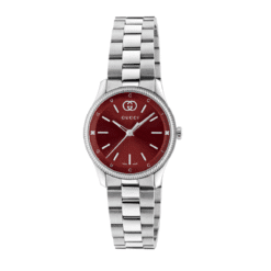 La línea G-Timeless se reinventa con una paleta de colores fresca, destacando los motivos característicos de la Casa. Impulsado por un movimiento de cuarzo, este reloj cuenta con una pulsera de acero inoxidable con una esfera burdeos.