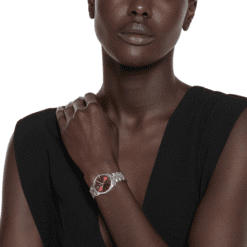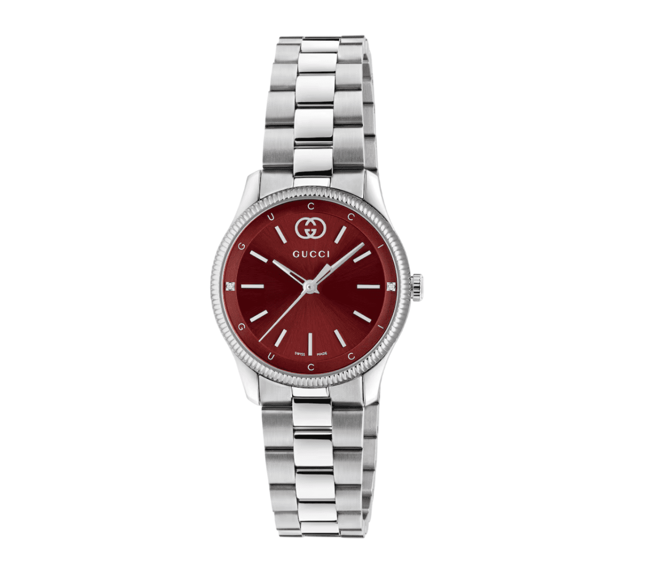 - Esfera burdeos con dos diamantes, detalle G entrelazado y letras Gucci