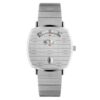 Este reloj de la línea Gucci Grip presenta un diseño limpio y aerodinámico que se ajusta perfectamente a la muñeca. La esfera de acero inoxidable tiene tres ventanas para mostrar la hora, los minutos y la fecha, completada con una pulsera a juego con G entrelazadas grabadas.