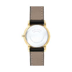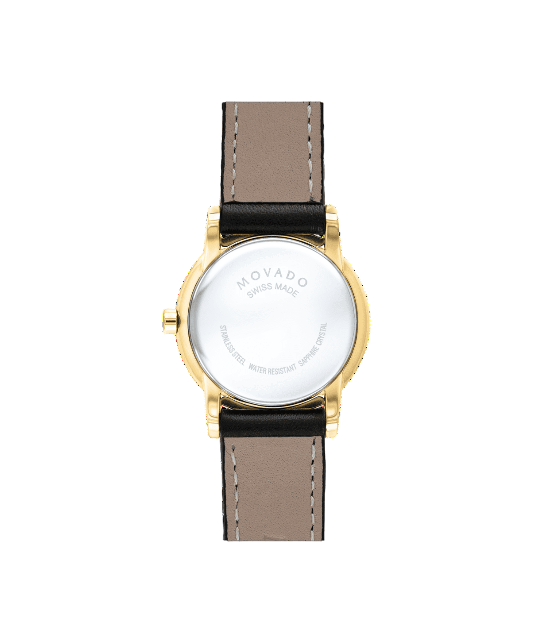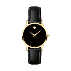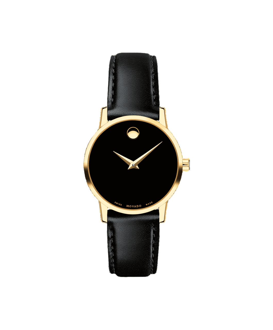 Reloj Museum Classic para mujer, caja de 28 mm de acero inoxidable con acabado PVD en oro amarillo, esfera Museum negra con puntos y agujas en tono oro amarillo, correa de piel de becerro negra lisa con hebilla de acero inoxidable con acabado PVD en oro amarillo.