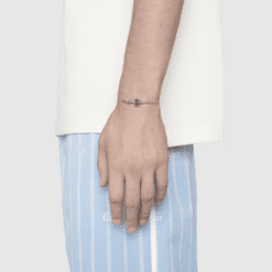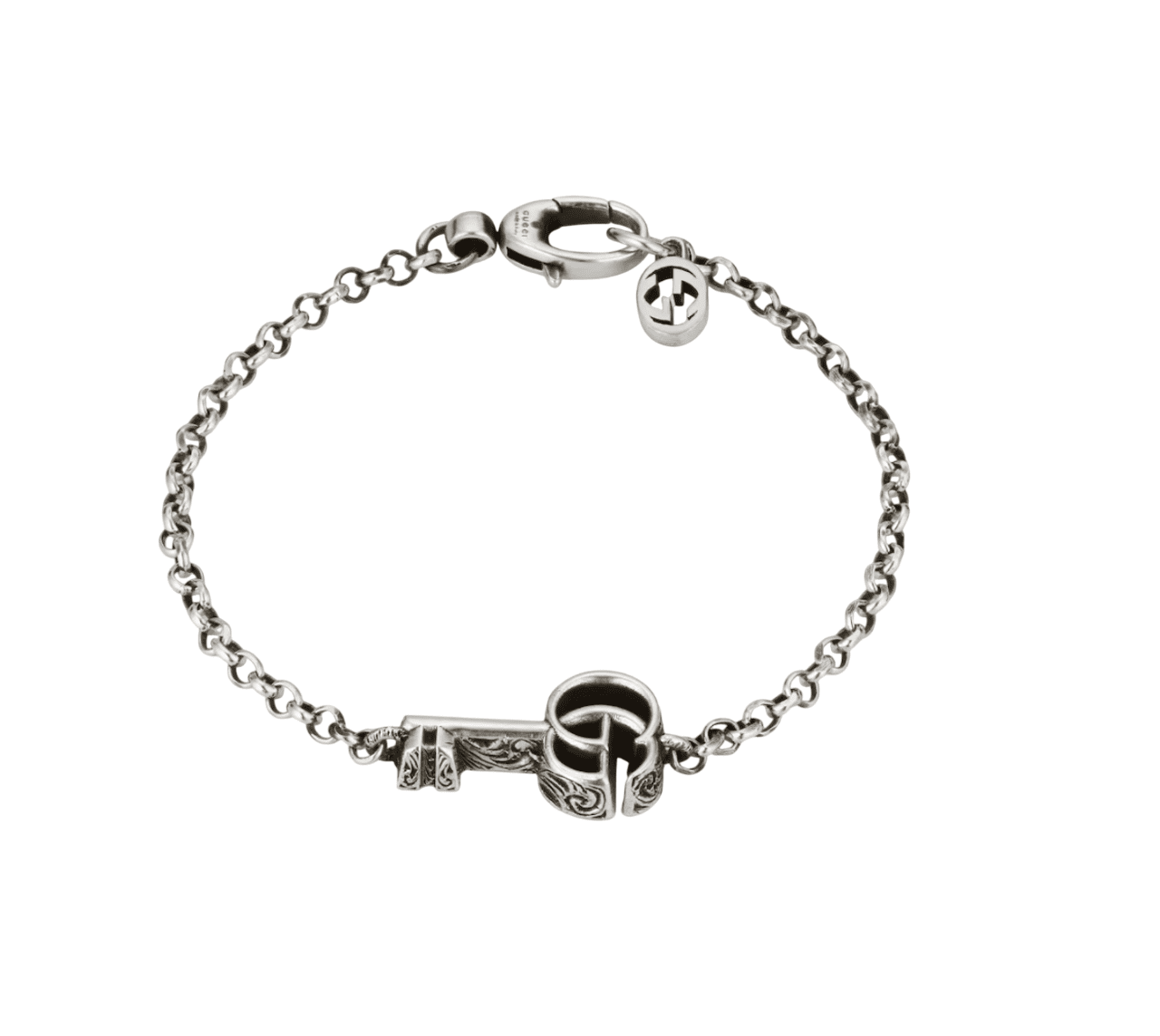 Esta pulsera de plata de ley, con acabado envejecido, presenta una llave con la reconocible Doble G como pieza superior. La colección de joyas de plata Gucci, elaborada con maestría, presenta diseños intrincados y con sutiles guiños a la Firma, y se ofrece en una amplia gama de piezas contemporáneas y clásicas.