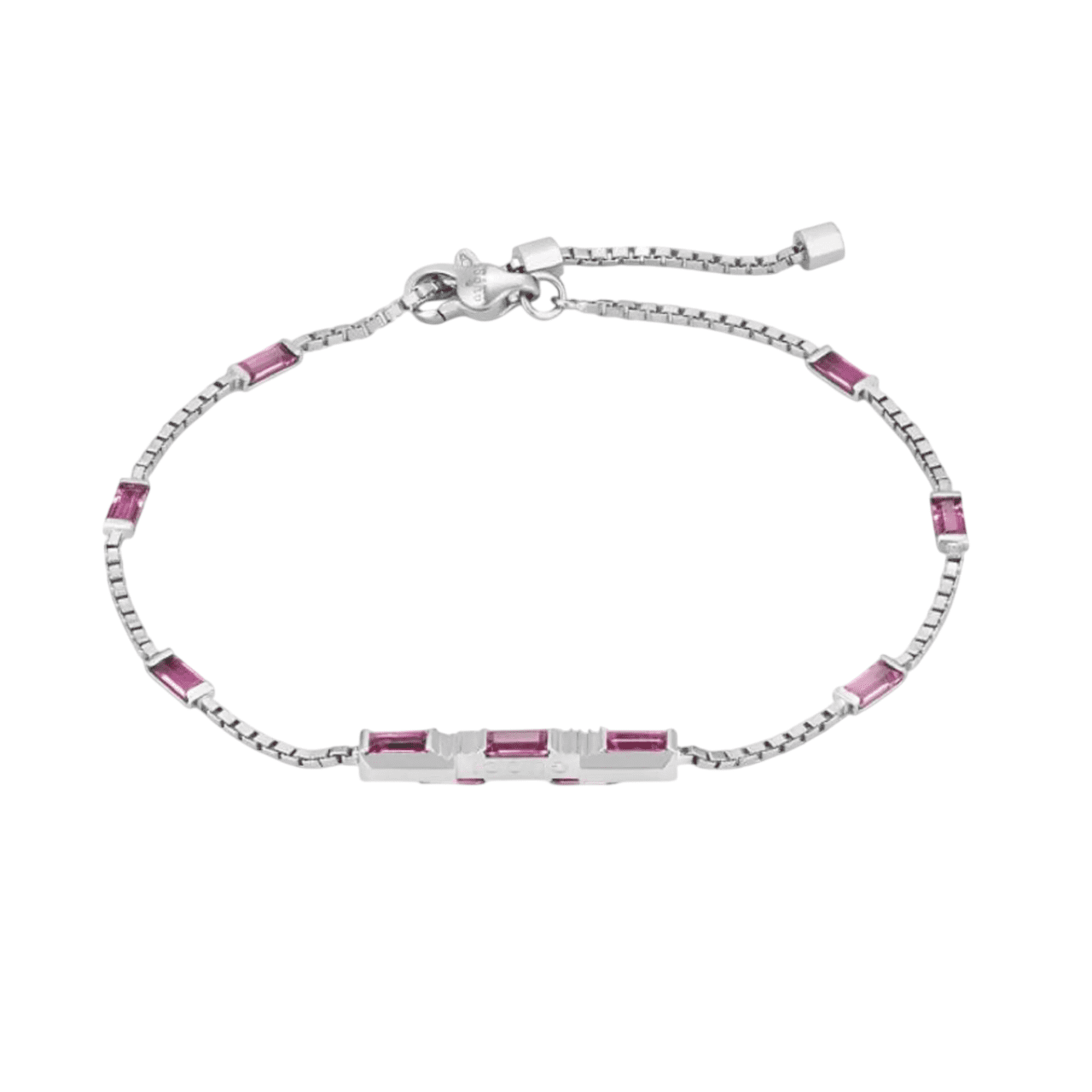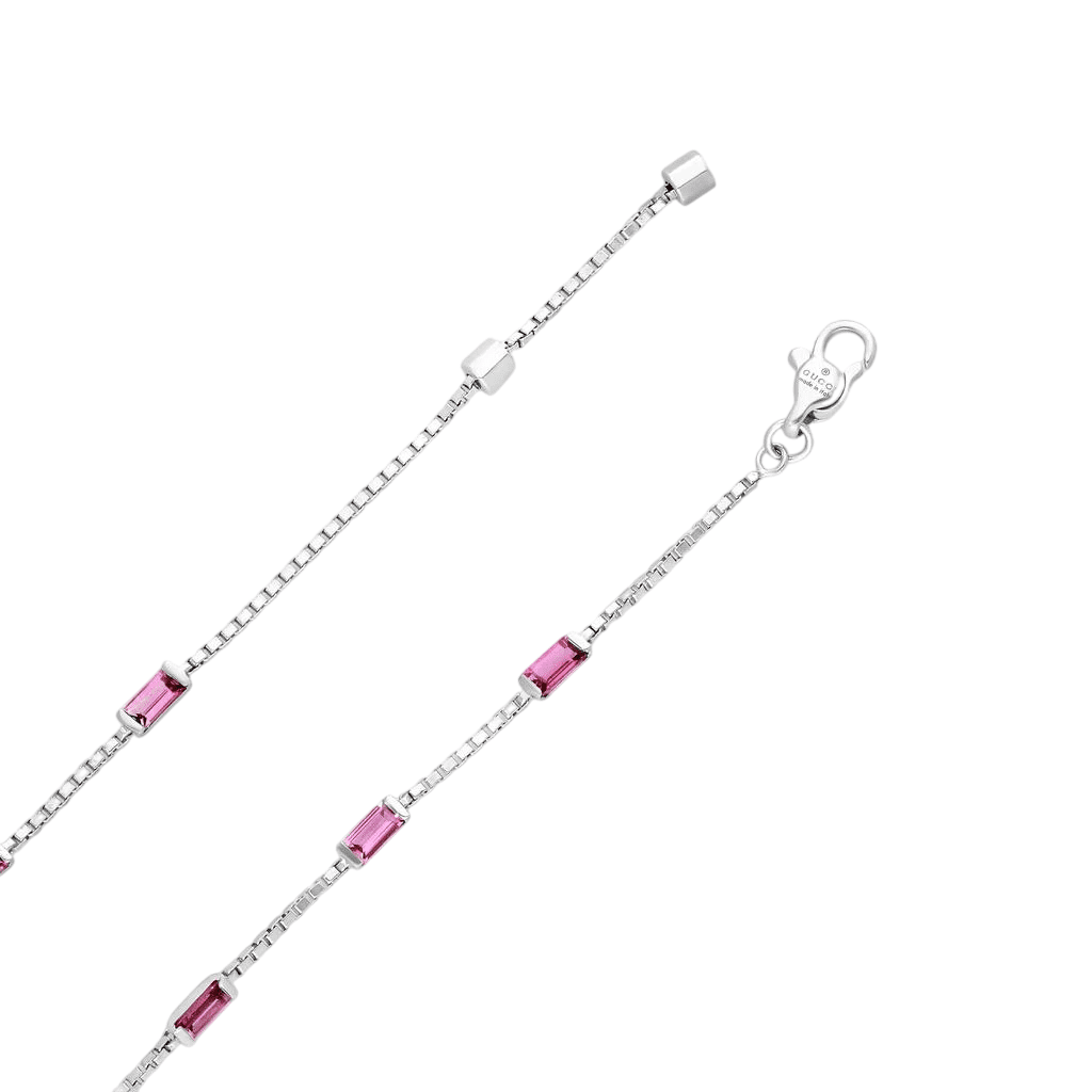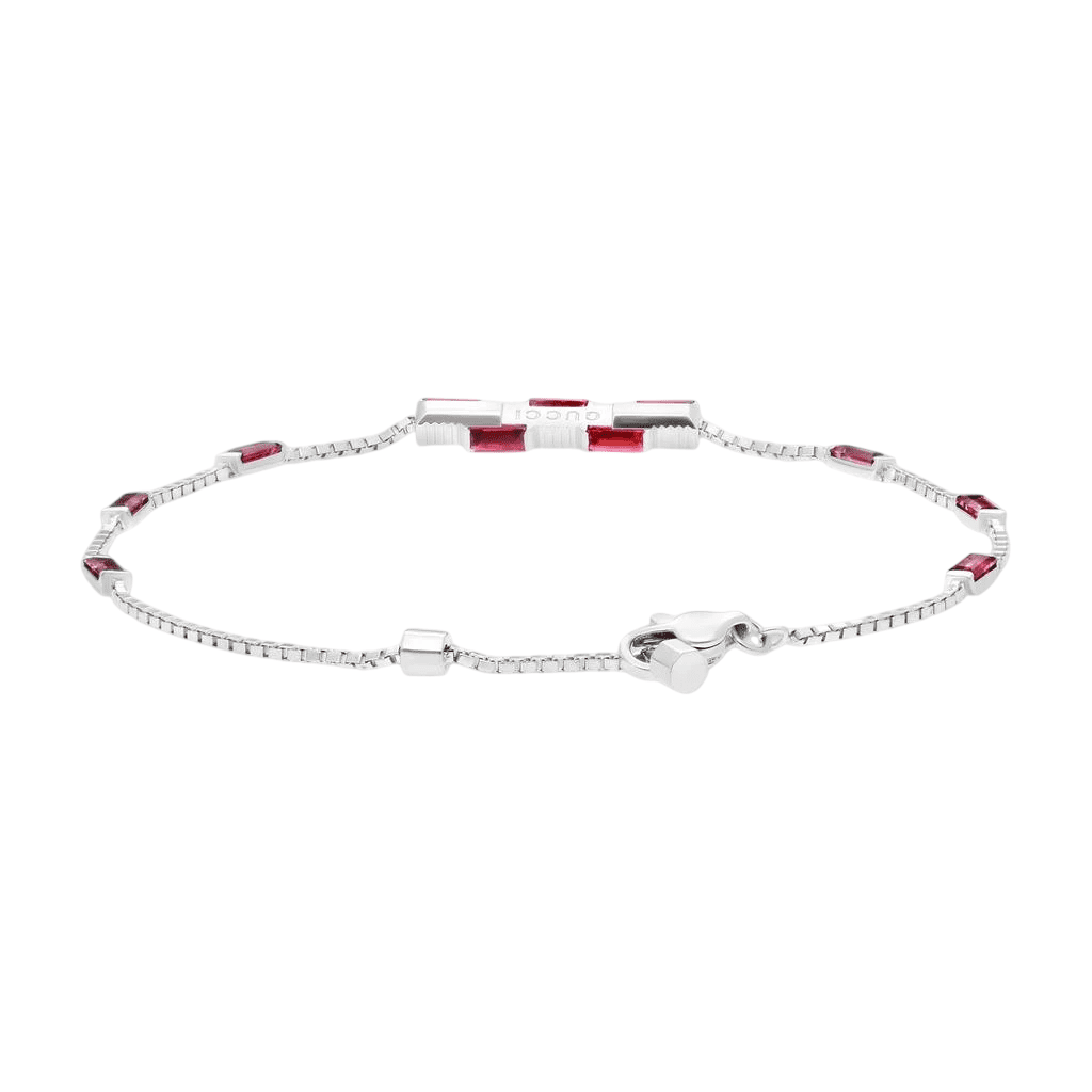 La colección Gucci Link to Love explora el romanticismo contemporáneo y cuenta con nuevos símbolos del amor. Todas las piezas de la colección inspiran formas personales de llevarlas gracias a la posibilidad de crear conjuntos en combinación con otras. Esta pulsera de oro blanco de 18 quilates se realza con incrustaciones baguette de rubíes en la barra colgante.