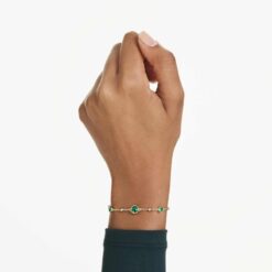 Con su dinámica mezcla de formas, esta pulsera Imber dará a tu muñeca un brillo distintivo. La cadena bañada en tono oro presenta un cierre de mosquetón y un strand de gotas de metal, intercaladas con cristales verdes redondos en un refinado engaste bisel. La pieza también incluye un alargador adicional, lo que permite que se ajuste a todos los tamaños. Perfecta para añadir un toque suave y elegante a cualquier atuendo.