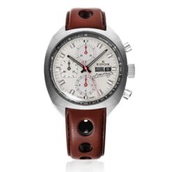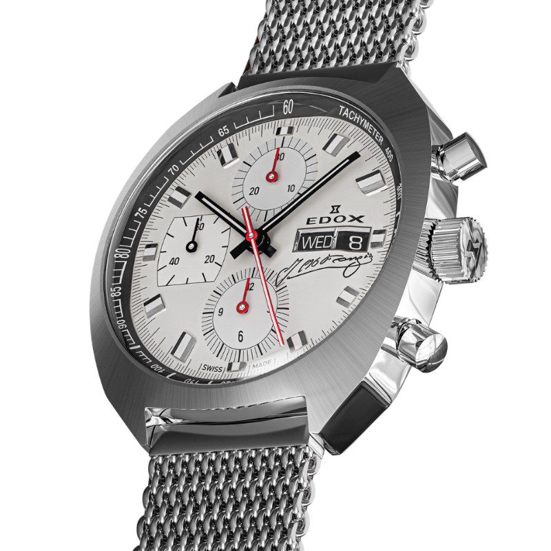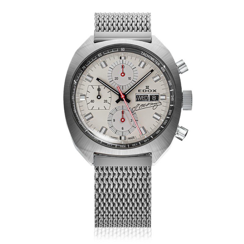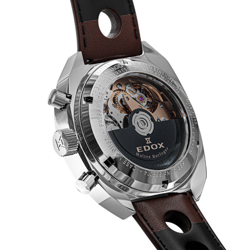 La tapa trasera transparente permite vislumbrar el interior del reloj, al tiempo que rinde homenaje a la histórica colaboración de Edox con la leyenda de las carreras Juan Manuel Fangio: una celebración perdurable de la precisión, el rendimiento y el estilo atemporal.