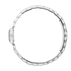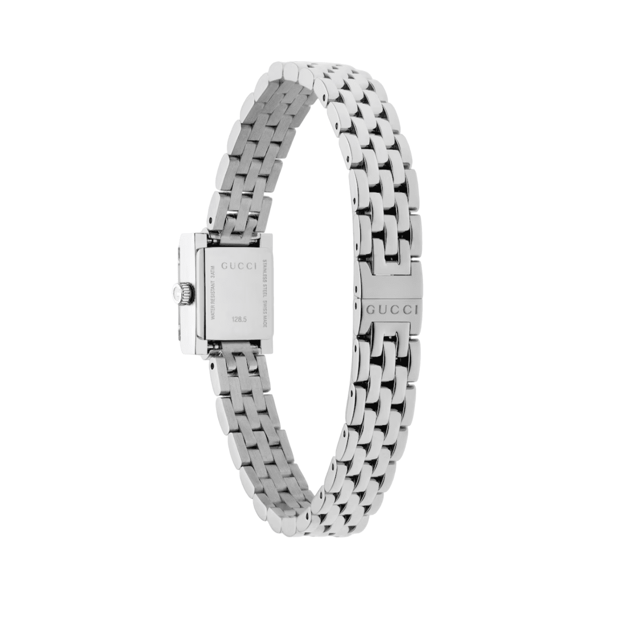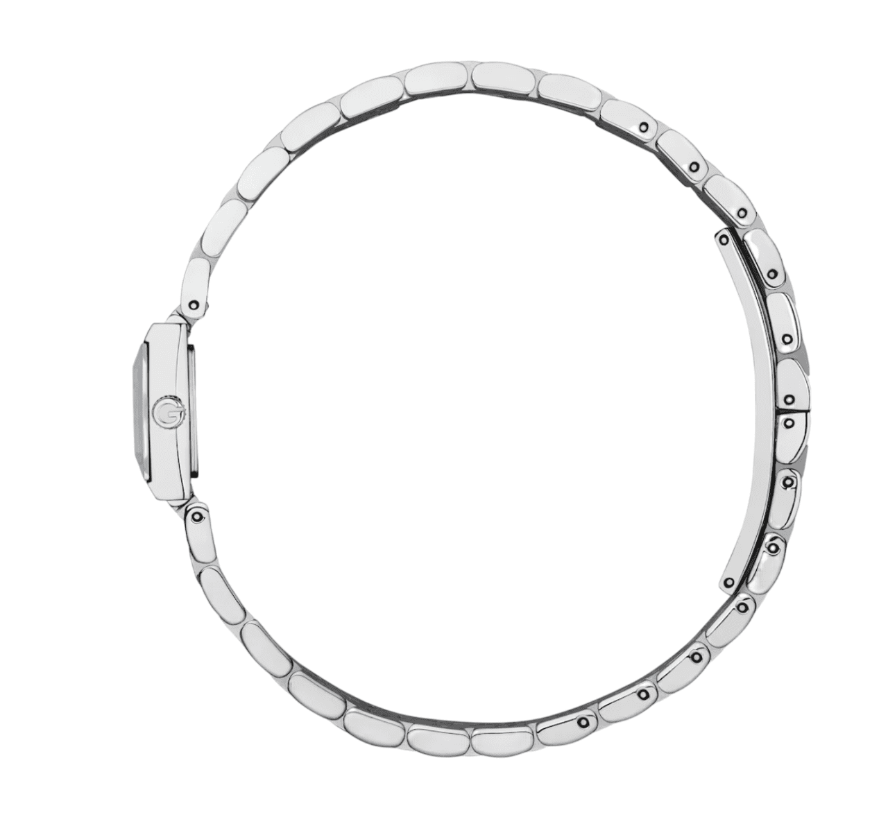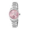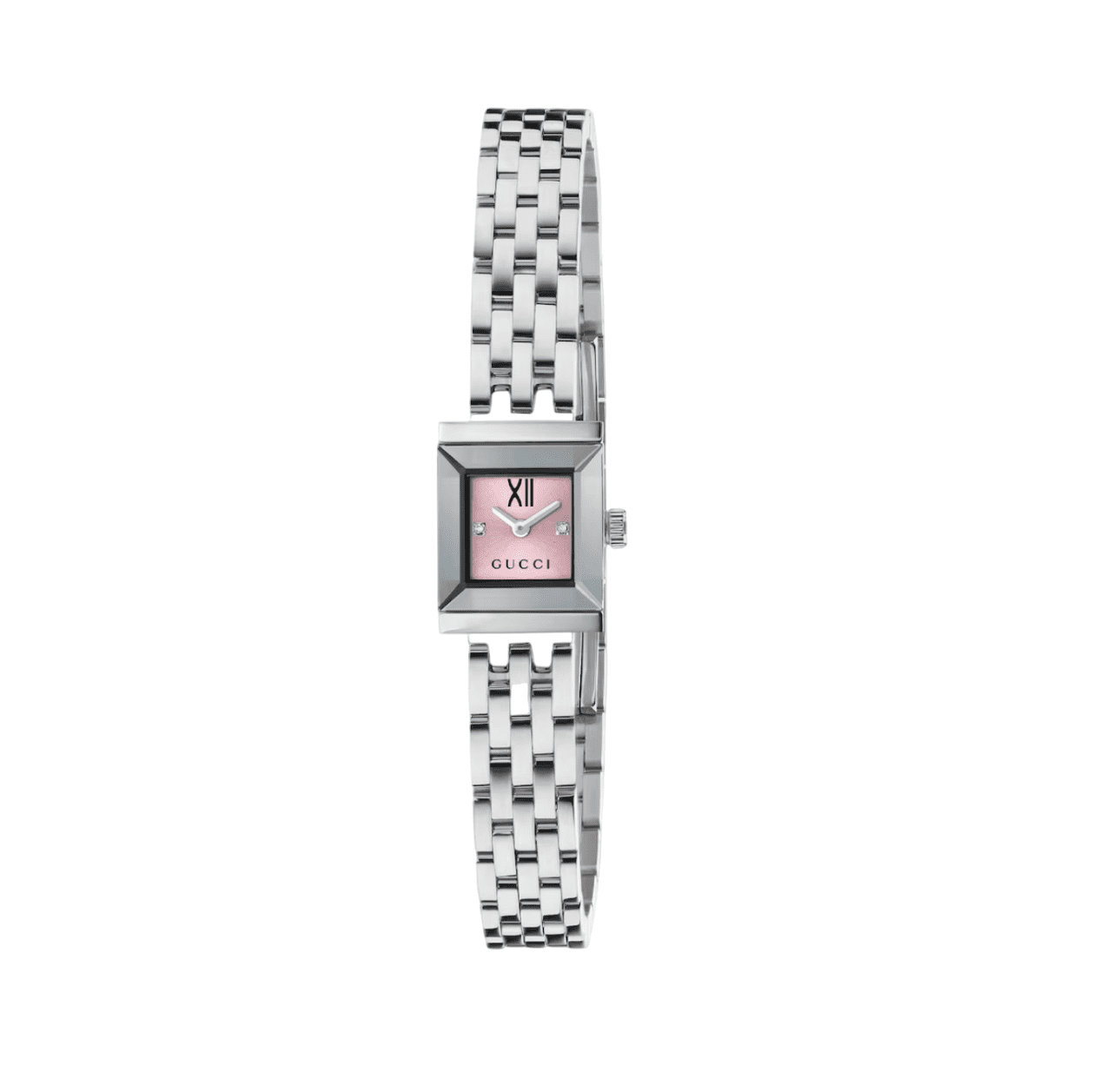 La colección G-Frame, que se caracteriza por su elegante caja cuadrada, combina detalles clásicos con una estética contemporánea. Fabricado con una caja de acero inoxidable, el accesorio está decorado con una esfera rosa con diamantes y una correa de acero inoxidable.