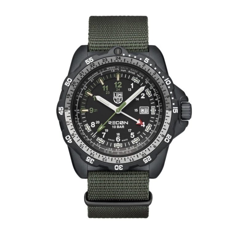 Equipado con movimiento de cuarzo suizo con función GMT, bisel giratorio unidireccional y brújula desmontable, se complementa con una correa técnica con escalas de medición integradas para cálculo de distancias. Este set incluye además una correa adicional, ofreciendo mayor versatilidad en uso táctico o outdoor.