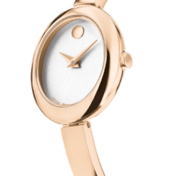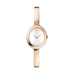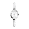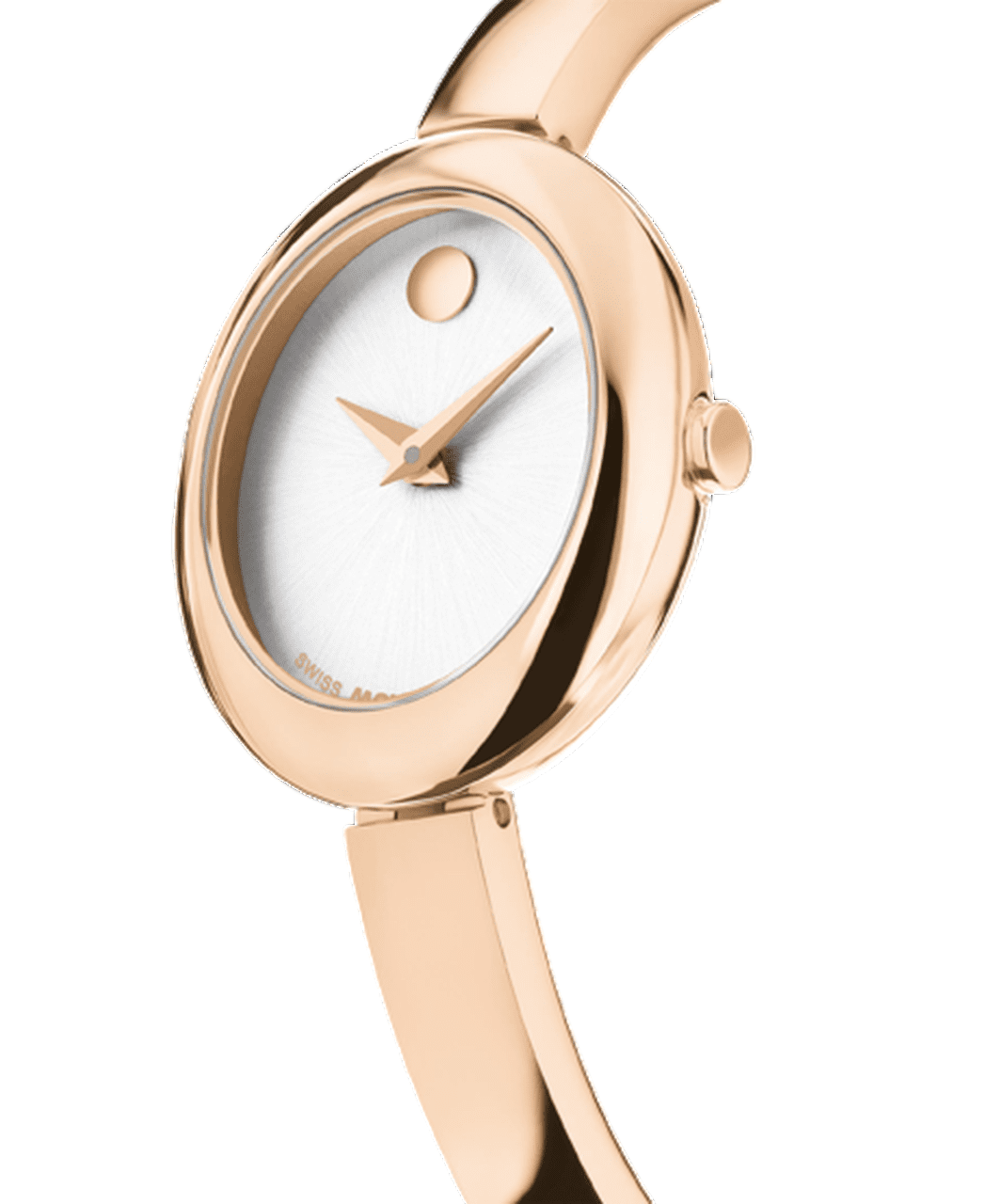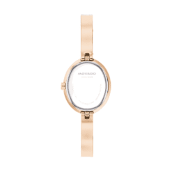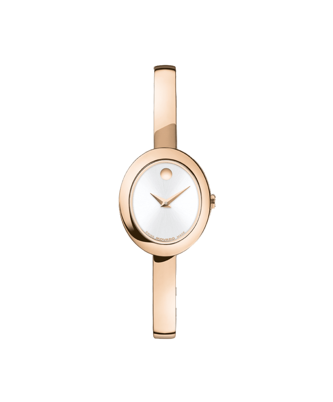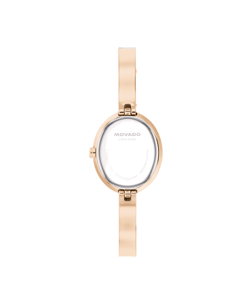 Este reloj de 21,5 mm por 25,5 mm cuenta con una esfera ovalada de rayos de sol blanco plateado, manecillas de delfín en tono oro rosa y nuestro punto característico a las 12 en punto.