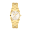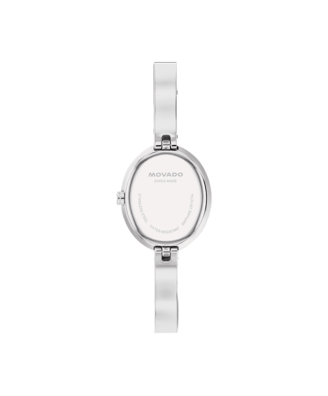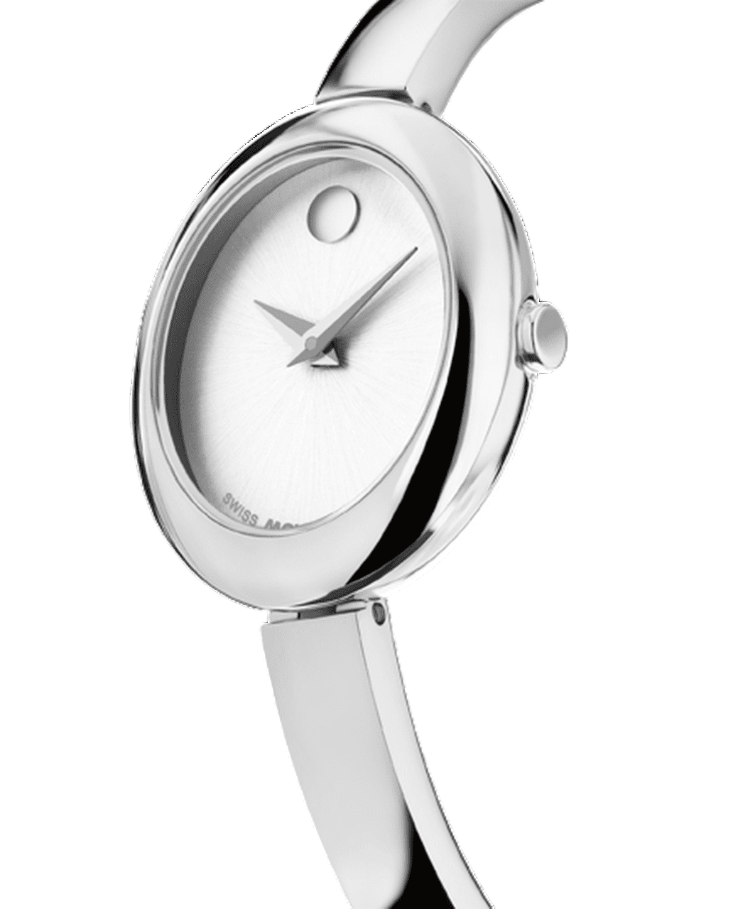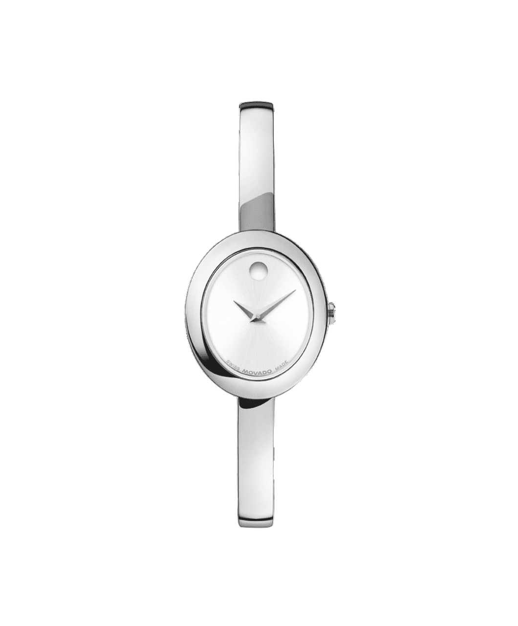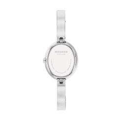 Este reloj de 21,5 mm por 25,5 mm cuenta con una esfera ovalada blanca plateada de rayos de sol, manecillas de acero y nuestro punto característico a las 12 en punto.