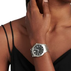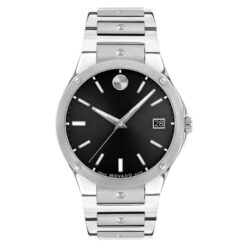 Este reloj de 41 mm cuenta con una esfera color negra, calendario diario y el exclusivo motivo de puntos.