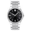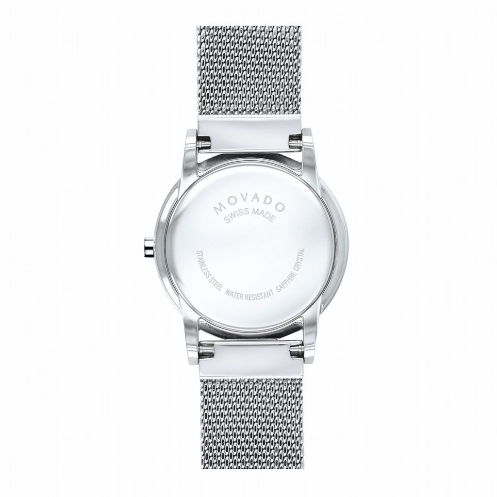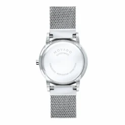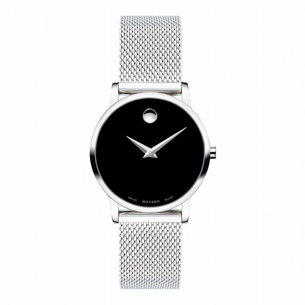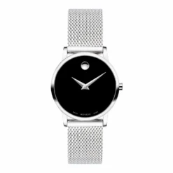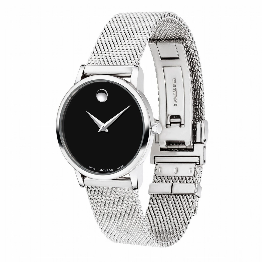 Reloj Museum Classic para mujer, caja de acero inoxidable de 28 mm, esfera negra Museum y punto y manecillas plateadas, brazalete de malla de acero inoxidable con hebilla de cierre deslizante.