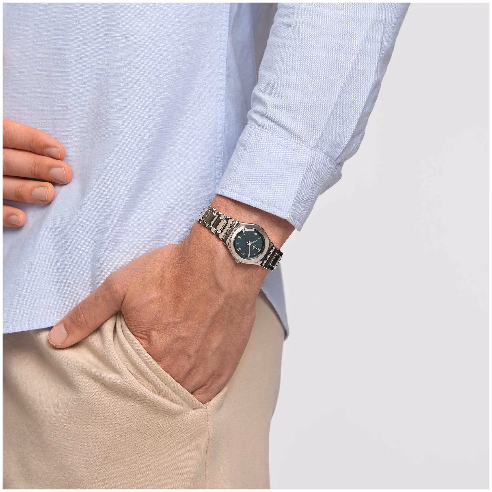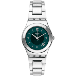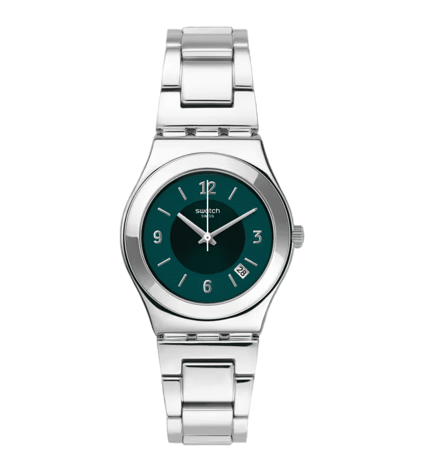Ni grande, ni pequeño: MIDDLESTEEL tiene el tamaño perfecto y una esfera verde oscuro con apliques de Swatch y ventana de fecha. El brazalete de acero inoxidable va a juego con la caja.