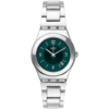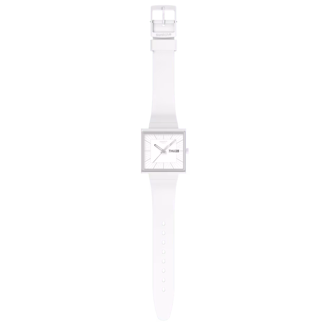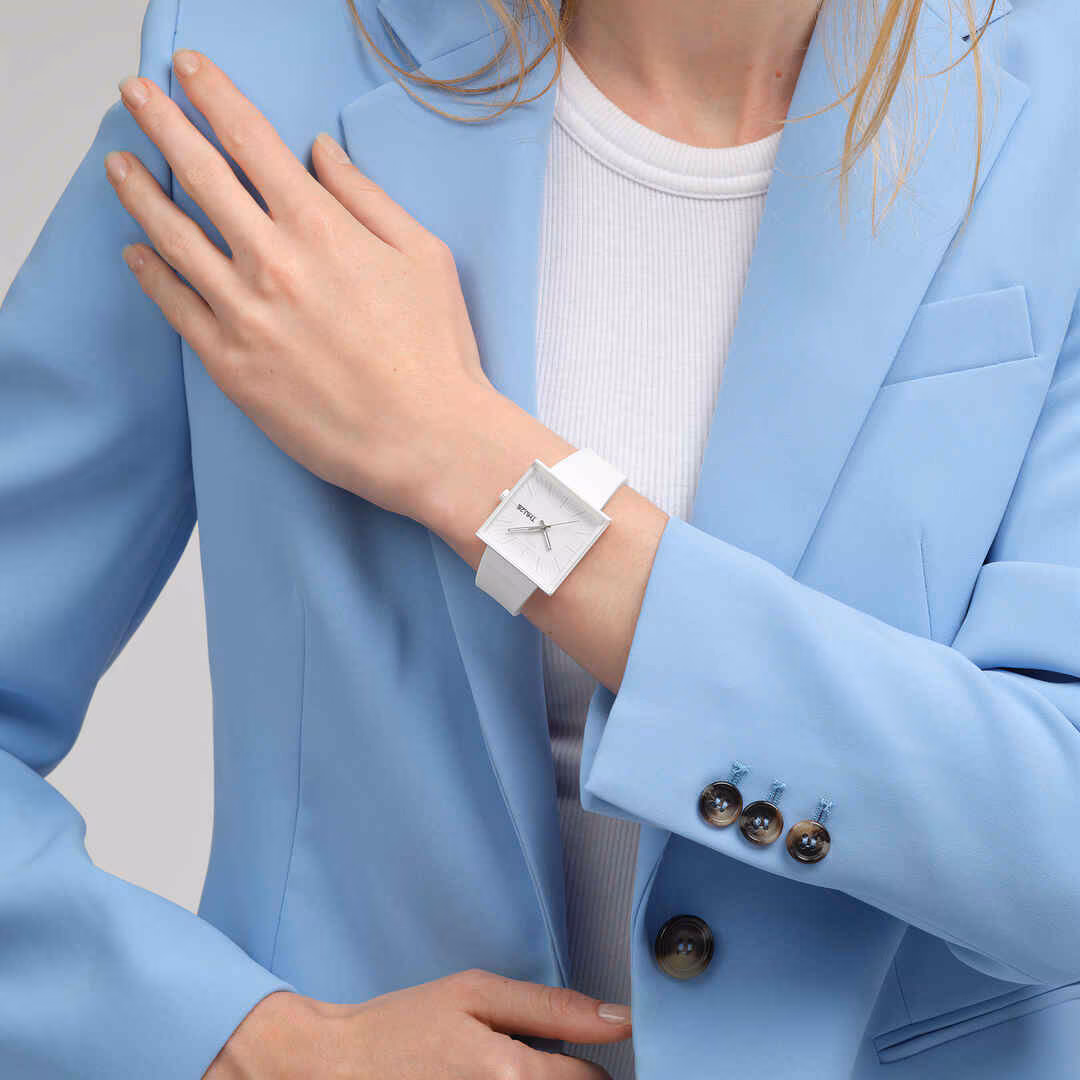 La caja cuadrada mate blanca en BIOCERAMIC de este reloj cuenta con un cristal de origen biológico de borde a borde que ofrece una vista lateral de los índices y de los marcadores de minutos impresos en gris. La esfera blanca cuadrada tiene la aguja horaria y el minutero plateados y brillan en la oscuridad, un segundero plateado y una ventana que indica la fecha y el día a las 3 horas. La esfera se complementa con una correa blanca mate integrada con trabilla y hebilla a juego. La tapa de la pila en la parte posterior está lleva impresa la vista frontal del reloj.