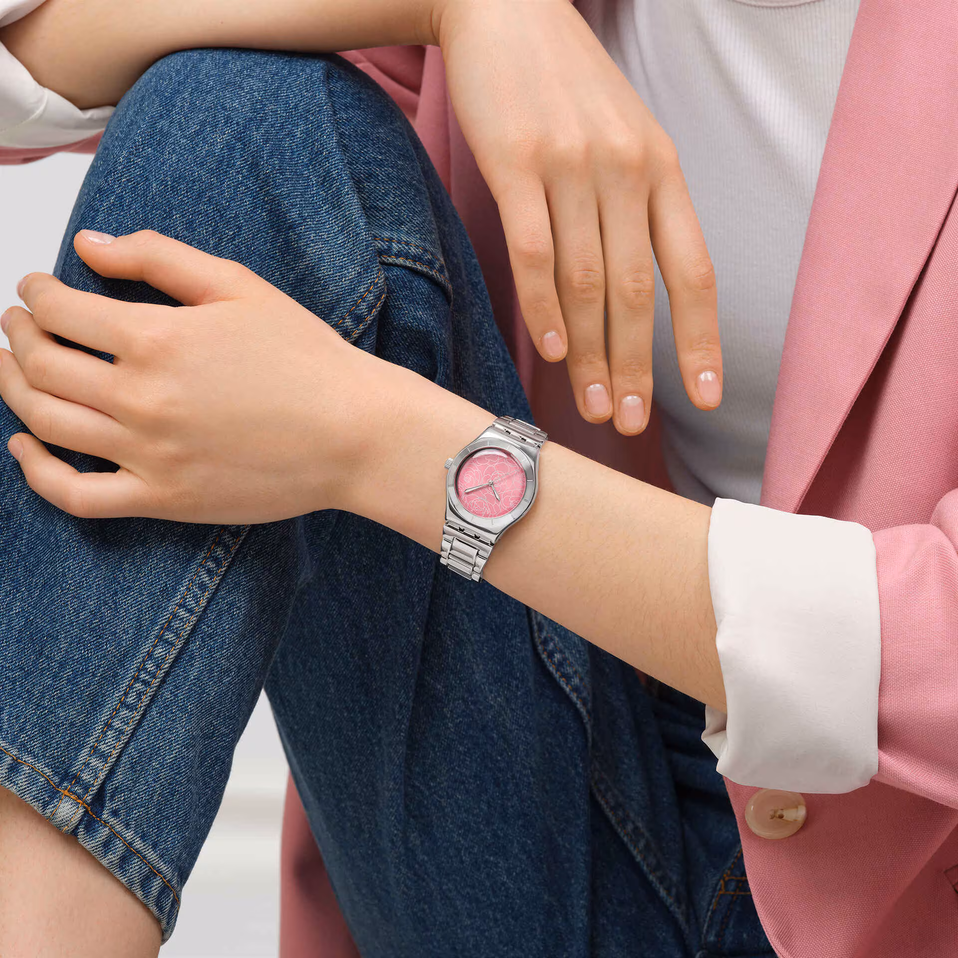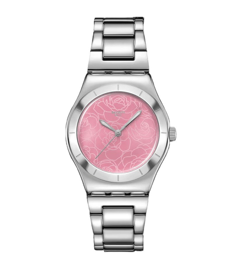 Este elegante reloj de acero inoxidable tiene una esfera rosa cepillada al sol con un motivo floral impreso en blanco, aguja horaria y minutero plateados que brillan en la oscuridad y segundero plateado. Presenta una caja de acero inoxidable pulido y un bisel a juego con índices grabados. Una pulsera de acero inoxidable pulido y una hebilla de mariposa completan su aspecto.