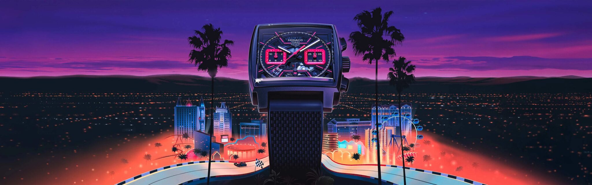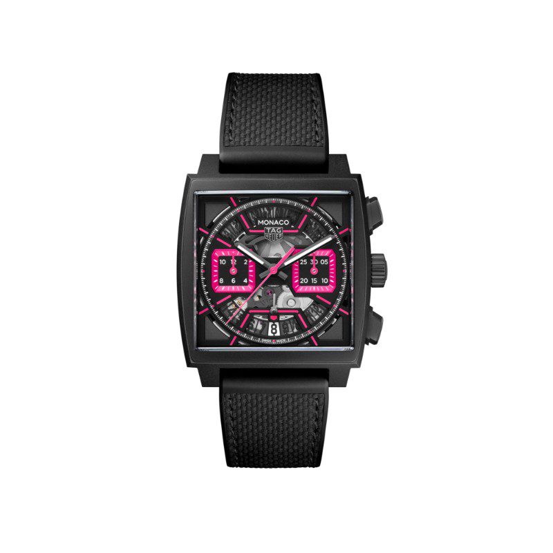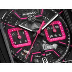 La esfera esqueleto arenada negra cobra vida con vibrantes detalles en rosa y contadores en rosa opalina, que crean un atrevido despliegue de color y artesanía.