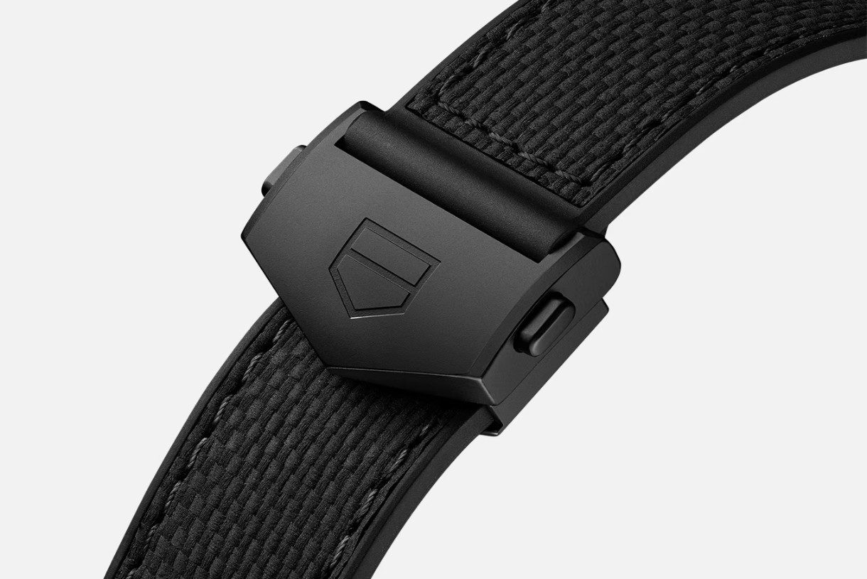 La caja de titanio de 39 mm con revestimiento de DLC negro, ligera y resistente, se presenta con una correa de piel de becerro negra repujada y caucho: el epítome de la elegancia deportiva.