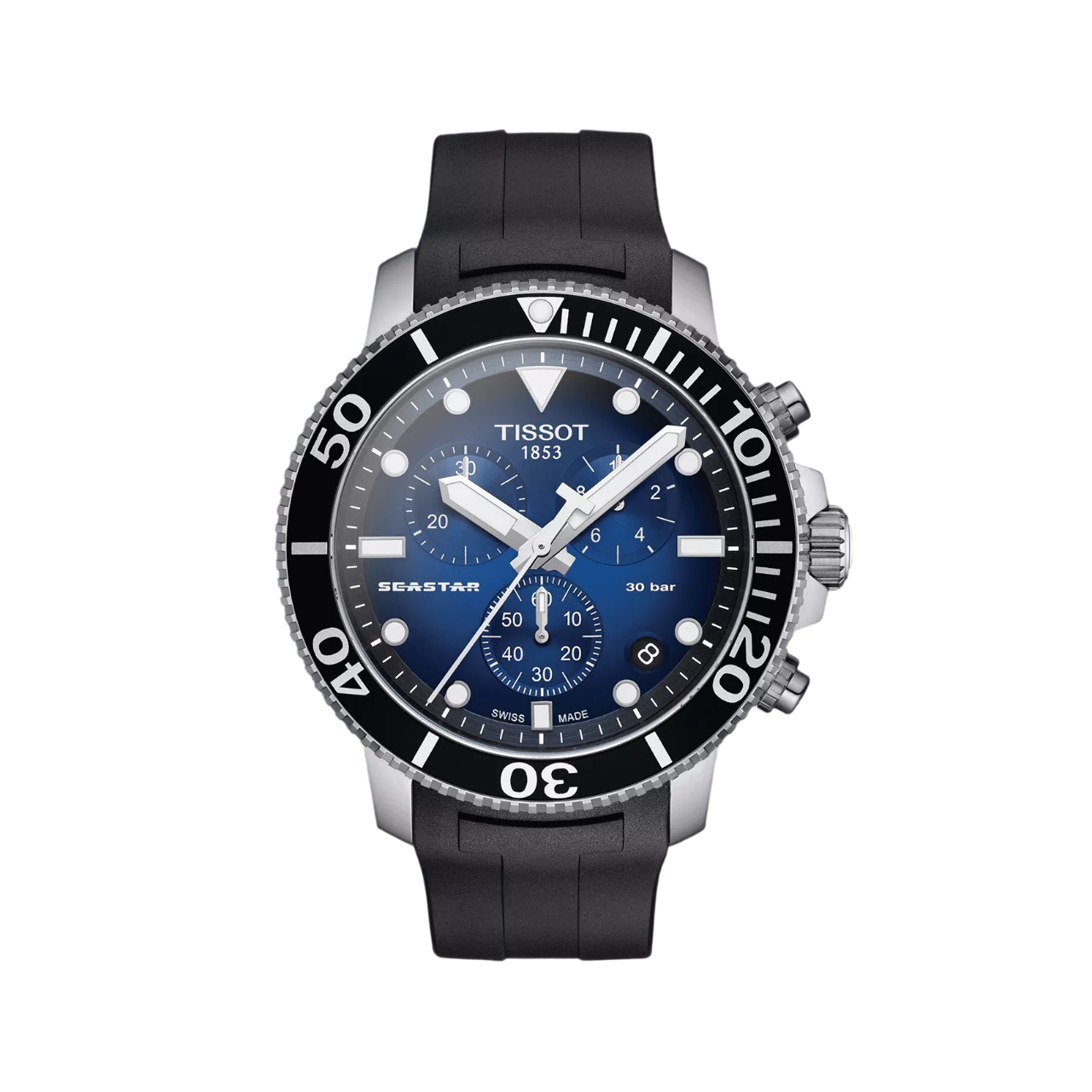 La colección Tissot Seastar 1000 Quartz Chronograph presenta un alto rendimiento gracias a una impresionante resistencia al agua hasta una presión de 30 bares / 300 m. Su caja y corona roscadasprotegen al reloj de los daños, mientras que el bisel de acero unidireccional y su movimiento suizo de cuarzo cronógrafo convierten a estos modelos en un imprescindible para los amantes del deporte acuático.